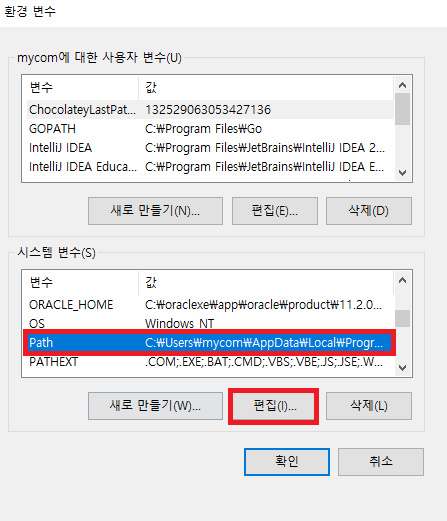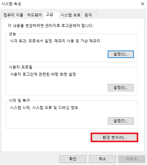 만약 위의 창이 뜨지 않을 시 환경 변수를 설정해주자.