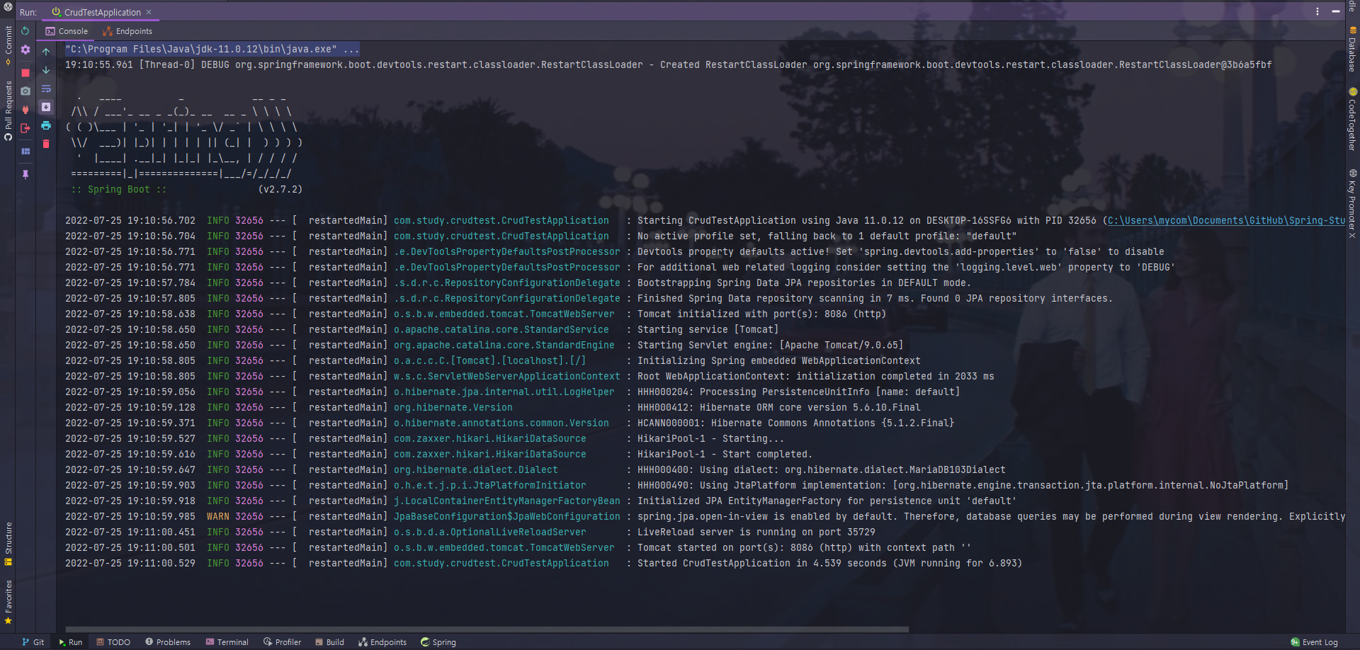나는 DB명을 crud_test라고 지었다.