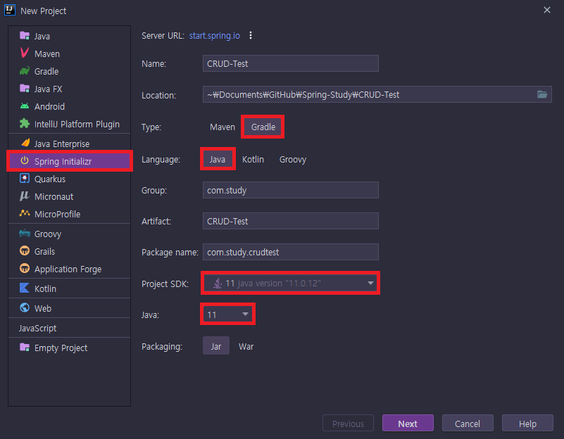 Java 버전은 11버전 이상으로 선택하도록하자.